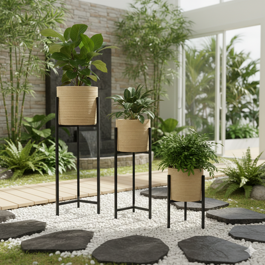 Ligereza y Versatilidad: Gracias a su material, es fácil de mover y reorganizar según tus necesidades de decoración. Es ideal como portamaceta para cubrir las bases plásticas tradicionales.